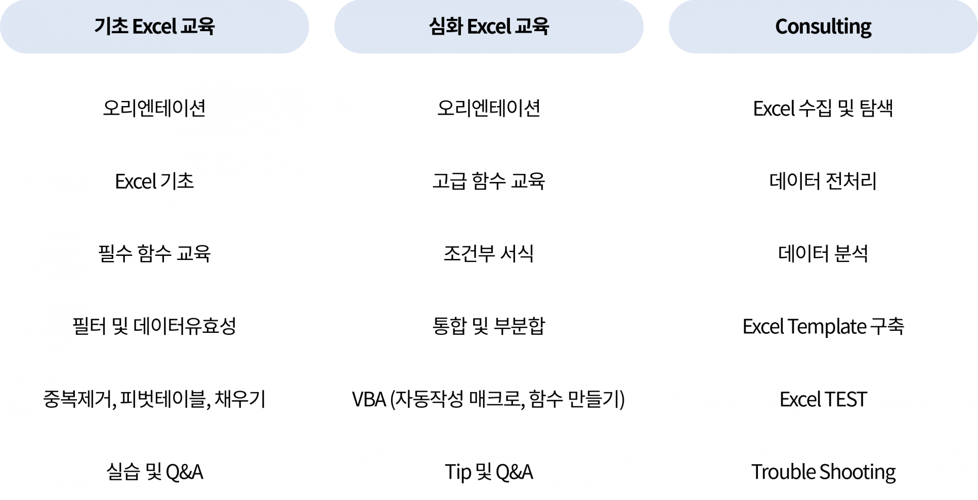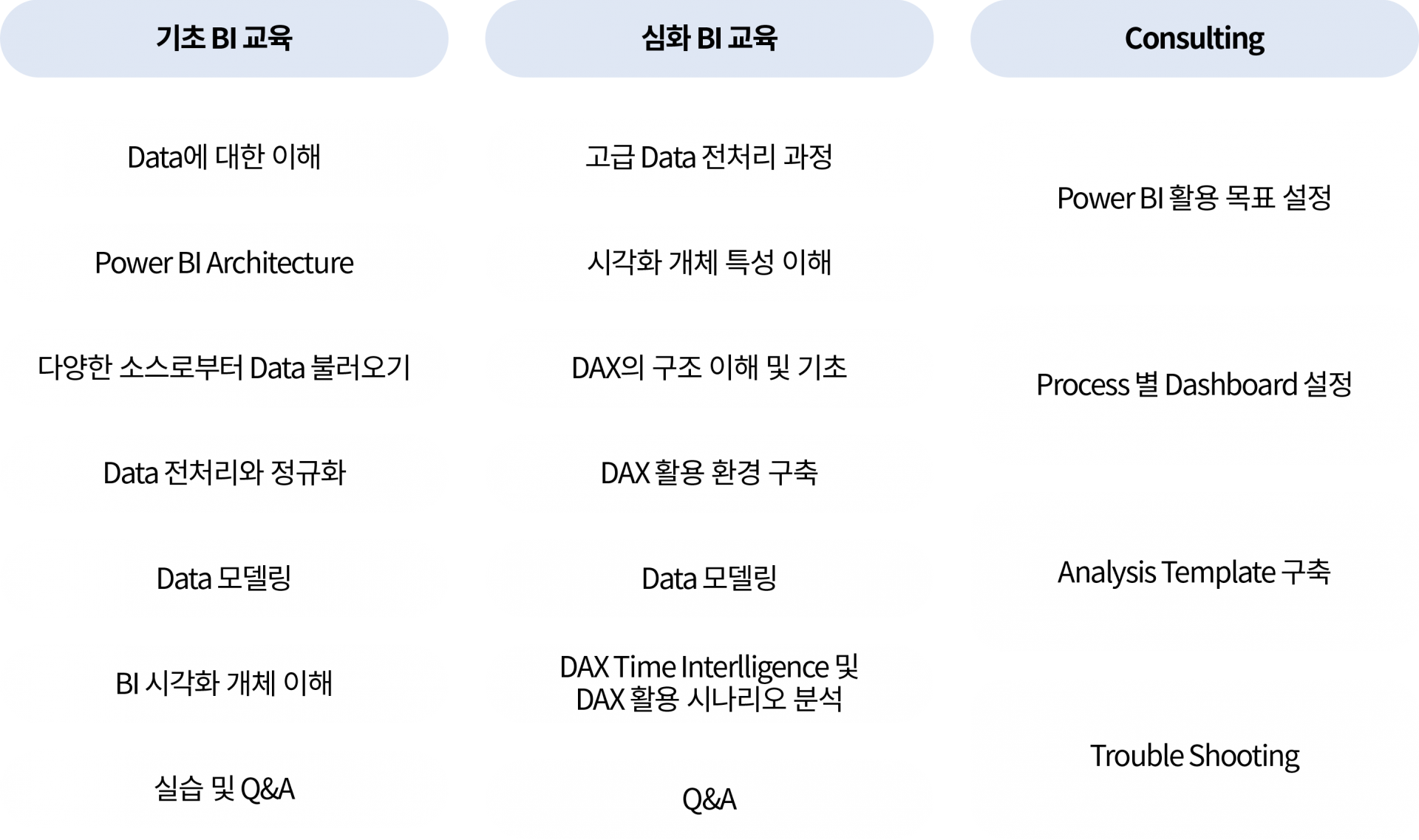 * Consulting과 교육의 구분을 위해, 교육 시 Q&A는 사전 제공 Data 내에서만 가능하며, 교육은 1일 8시간(09:00 ~ 18:00) 기준으로 고객사의 요청에 따라 커리큘럼이 변경될 수 있습니다.